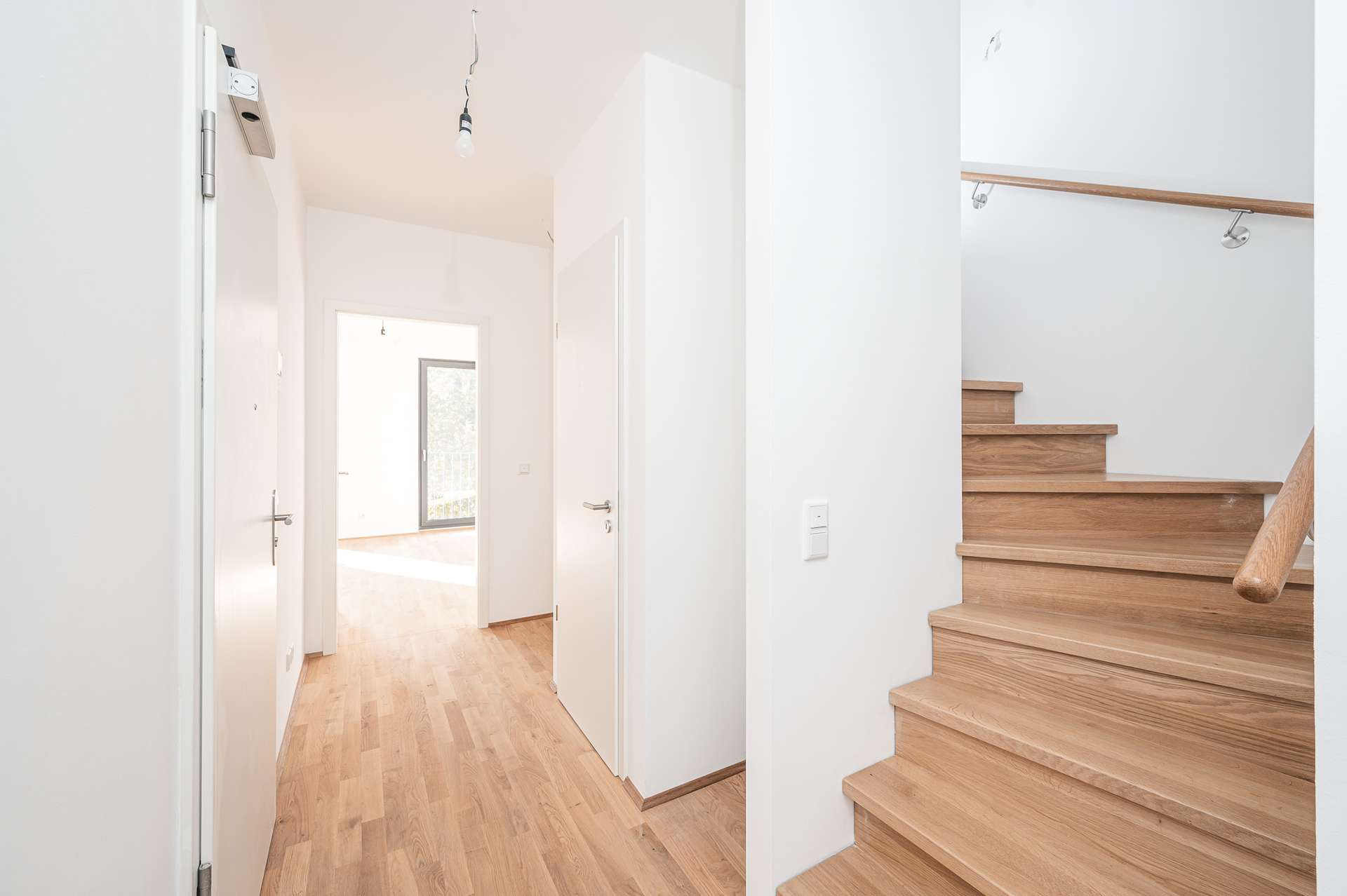 Besonderes Augenmerk liegt auf der lichtdurchfluteten und offenen Gestaltung der Räume im Obergeschoss, die eine warme und einladende Atmosphäre schaffen. Im 2.OG befinden sich die privaten Schlafräume dieses Wohnjuwels. In der Wohnung finden Sie Echtholz Dielen aus Eiche und hochwertige Objekte und Armaturen in den Bädern.
